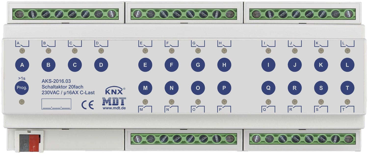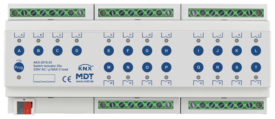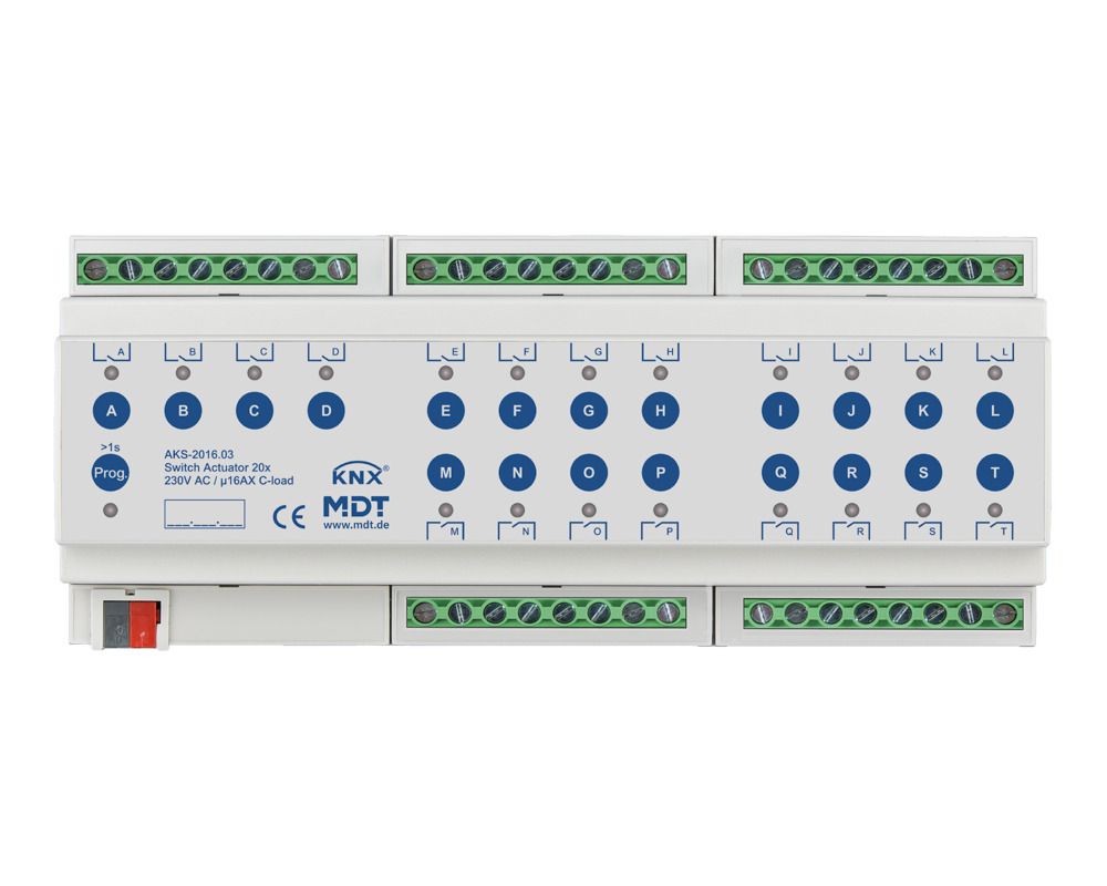 MDT AKS-2016.03 Schaltaktor 20fach 12TE REG 16A 230VAC C-Last Standard 140µF