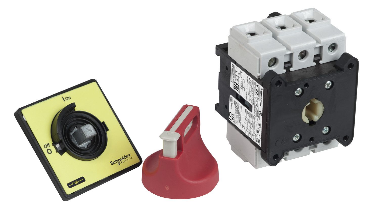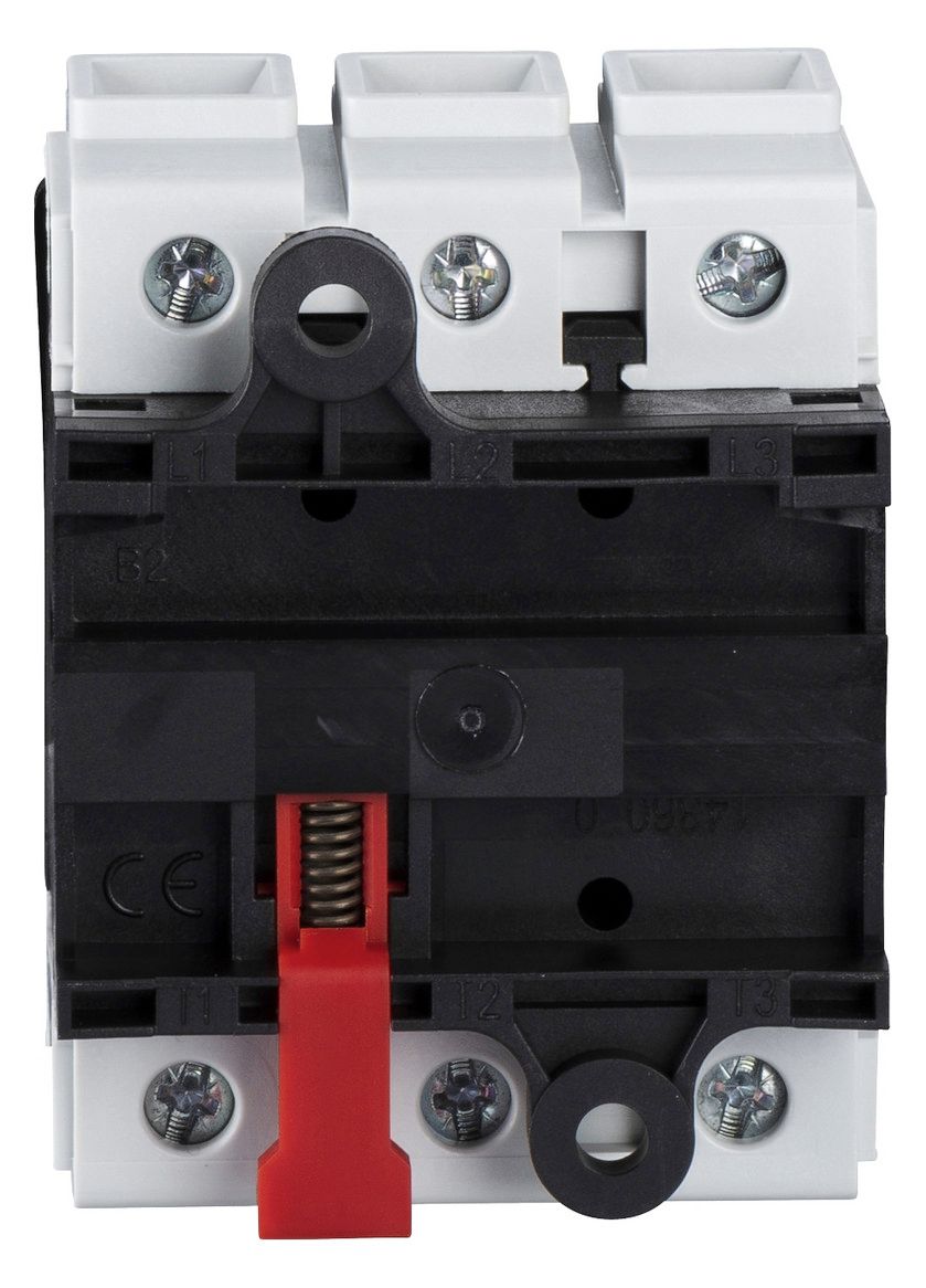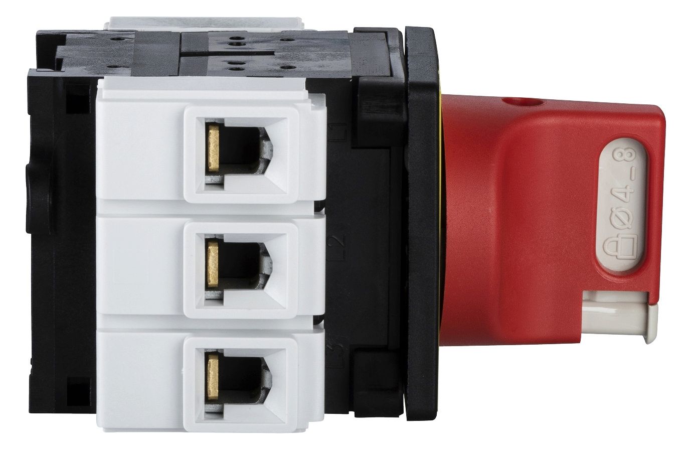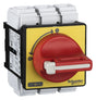 Not-Aus/Hauptschalter, 3P, 690V, 50A, Im Gehäuse. Baugroesse_A 63 A, Befestigung 4 Schrauben, Frontschild 60 x 60 mm. Komplettgerät, 3-polig, IP 65, mit Drehantrieb. Für Befestigung in der Schaltschranktür. Roter Griff, abschließbar mit 3 Vorhängeschlössern DM 4 mm bis DM 8 mm (Lieferung Ohne Vorhängeschlösser). Schalterstellung O I, Frontschild gelb.