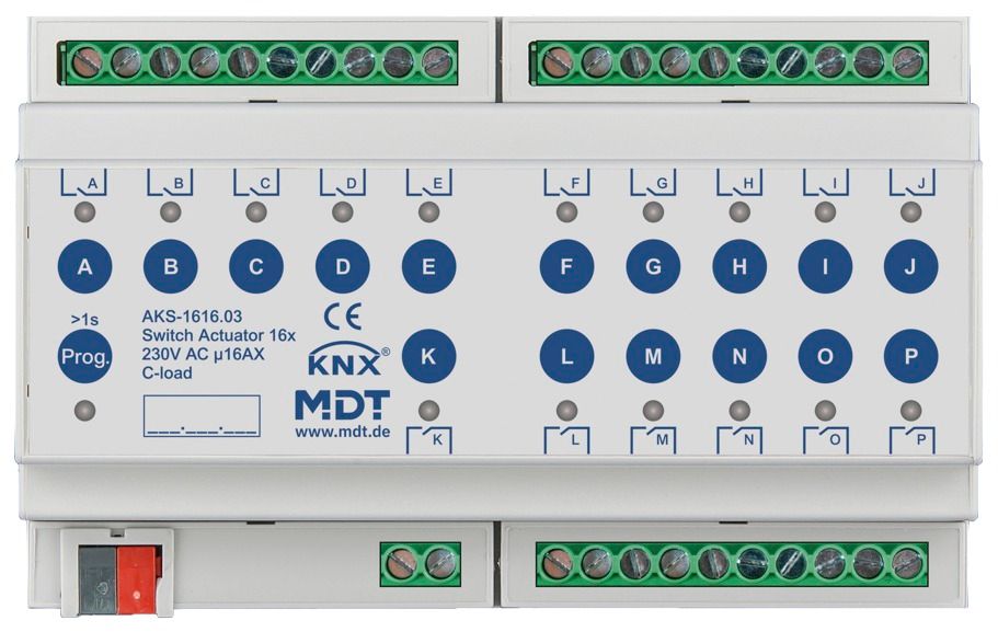 MDT AKS-1616.03 Schaltaktor 16fach 8TE REG 16A 230VAC C-Last Standard 140µF