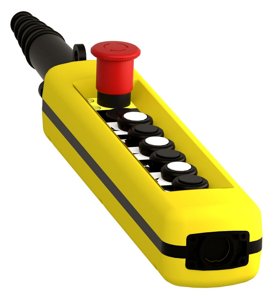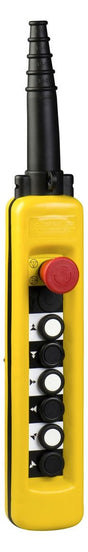 Hängetaster mit 8 Drucktastern und Not-Aus-Drucktaster für Steuerkreise. Diese Gelbe Kontrollstation ist doppelt isoliert und das Gehäusematerial aus Polypropylen. Es gehört zur Baureihe der Hängetaster Harmony XAC für 22-mm-Kunststoff-Signaleinheiten mit Durchmesser.