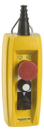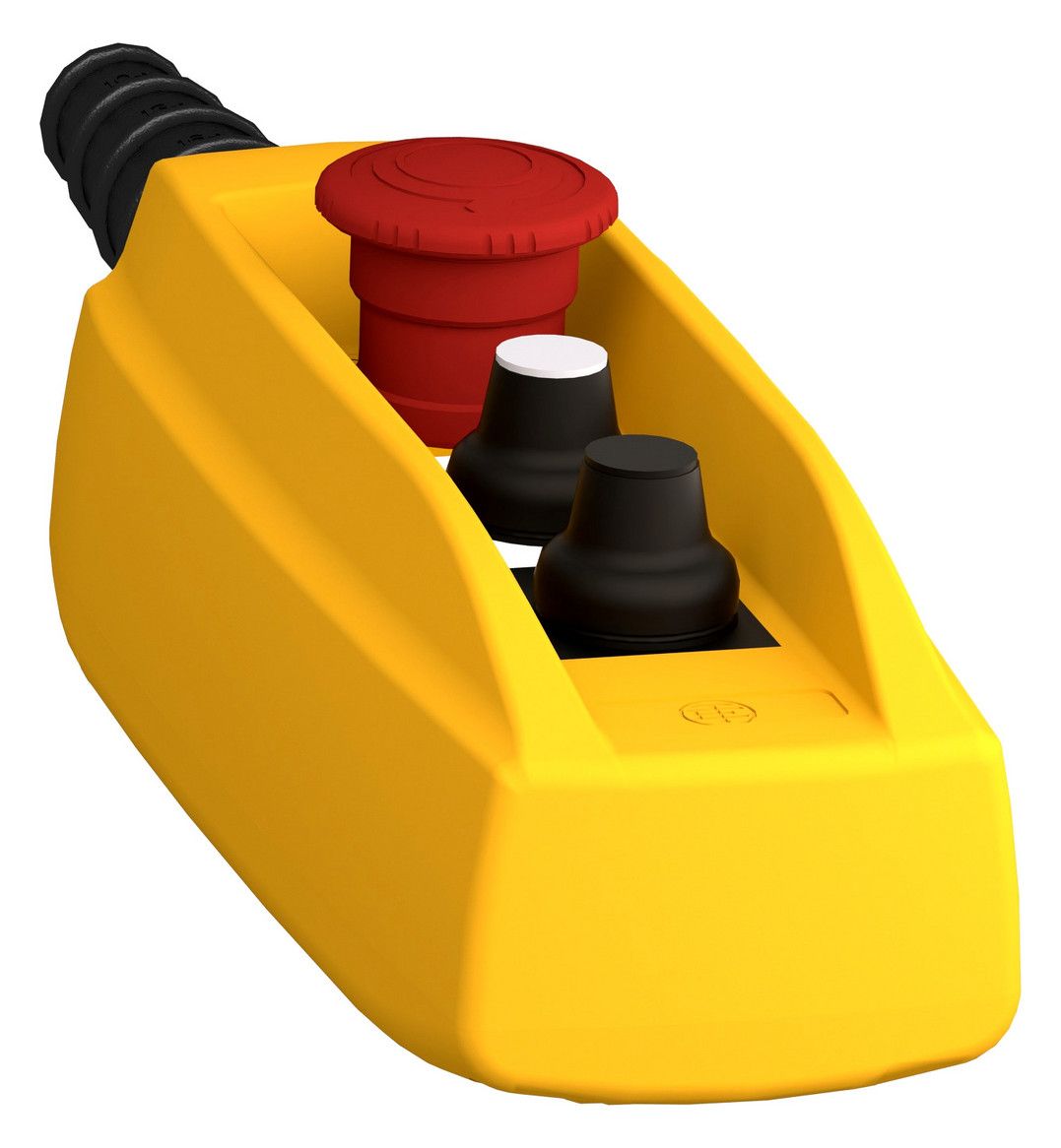 Hängetaster Harmony XACB. 2 Drucktaster, 1 x 40mm Not-Halt/Not-Aus überlistungssicher. Komplettgerät, schutzisoliert, für Steuerstromkreise, zum Schalten von Motoren mit 1 Geschwindigkeit. 2 Befehlsstellen, 2 Drehrichtungen, gegeneinander mechanisch verriegelt.
