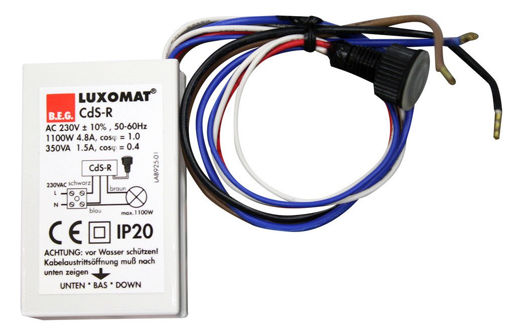 Dämmerungsschalter mit Schaltrelais, Zum nachträglichen Einbau in Außenleuchten und für den Einsatz in Abzweigdosen, Stufenlos einstellbarer Dämmerungswert, Länge der Verbindungsleitung zwischen Fotosensor und Elektronik ca. 15 cm, verlängerbar bis max. 1,50 m