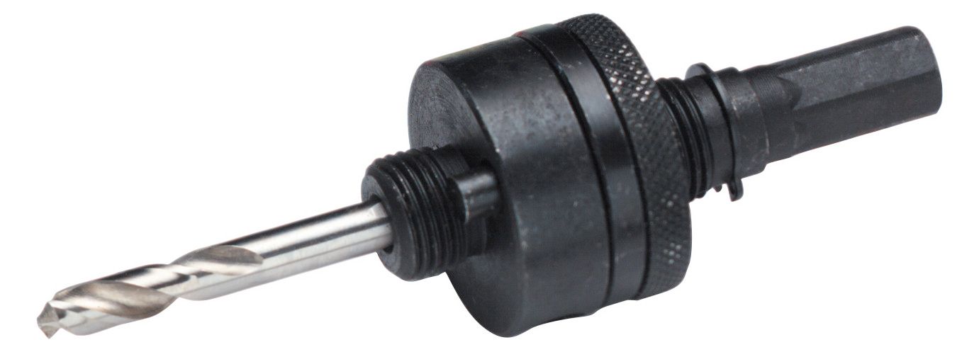 Aufnahmeschäfte komplett mit Führungsbohrer Bestellnr. 20 7590 und Außengewinde, passend zu Lochsägen aus HSS-Bi-Metall 11 mm Sechskant, mit Mitnehmer für Lochsägen 32 - 152 mm Durchmesser