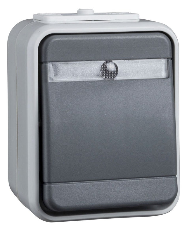 Wechsel-Kontrollschalter, 10 A 250V AC. Farbe: licht-/basaltgrau, mit lichtintensiver Glimmlampe, für Aufputzmontage. Schutzart IP 44, mit zwei Leitungseinführungen, Steckklemmen: Klemmbereich für Informationsleitungen ab Leitungsdurchmesser 0,5mm, für Kupferleiter 1,5 mm und 2,5 mm.