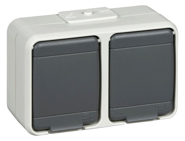 Steckdose 2-fach waagerecht, 16 A 250V AC. Farbe: licht-/basaltgrau, vorverdrahtet, für Aufputzmontage. Schutzart IP 44, mit zwei Leitungseinführungen, Schraubklemmen: Klemmbereich für Kupferleiter 1,5 mm und 2,5 mm, für den sicheren Anschluss von Aluminiumleitern 2,5 mm ohne Vorbehandlung.