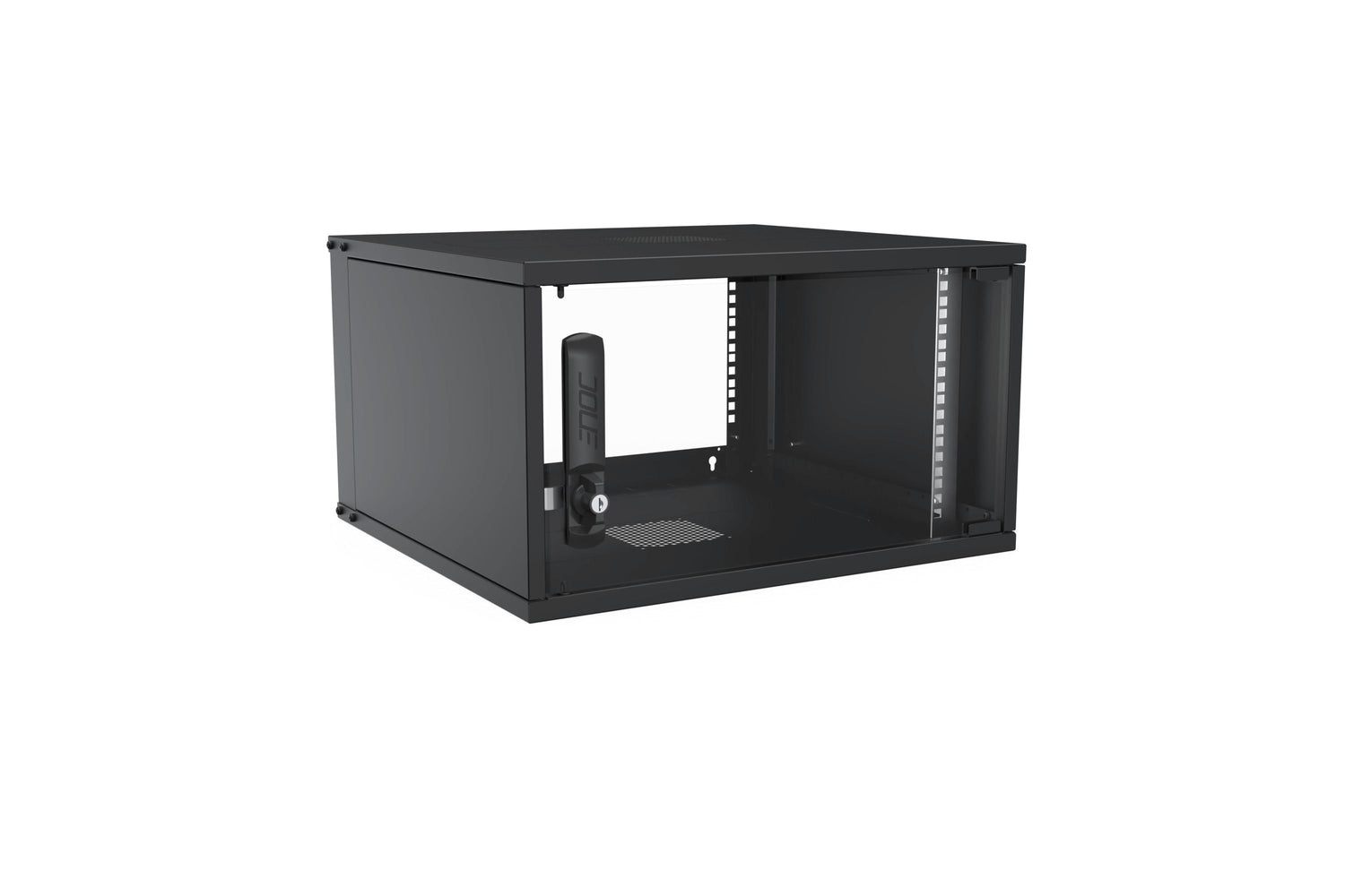 19” Profilpaar (482.6 mm) 6 HE vorne im Schrank montiert, kann stufenweise in 25 mm Abständen über die Schranktiefe verstellt werden. Montage einer zusätzlichen 19“ Befestigungsebene (482,6 mm) ist möglich (siehe Zubehör). 19” Lochraster 6 HE im hinteren Bereich des Wandschranks integriert, zur Montage von z.B. Kabelabfangschienen oder anderem Zubehör.