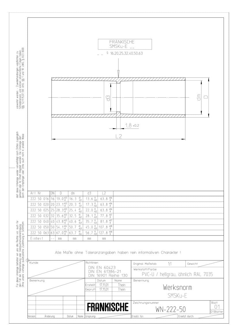 SMSKu-E ist eine Kunststoff-Steckmuffe aus PVC-U, in Farbe grau (RAL 7035), nicht flammenausbreitend. Verwendet wird diese Steckmuffe für die Kunststoff-Stangenrohre isofix-EL-F, FPKu-EM-F und FPKu-ES-F. VDE 0605 DIN EN 61386-21