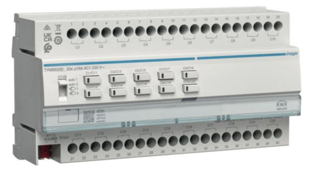 Schalt-/Jalousieaktor 20/10fach KNX Secure, 16A, C-Last.Schalt-/Jalousieaktor (REG) KNX Secure zum Schalten von unabhängigen Lasten oder zur Ansteuerung von Antrieben mit potentialfreien Schließern und kann mehrphasig angeschlossen werden.