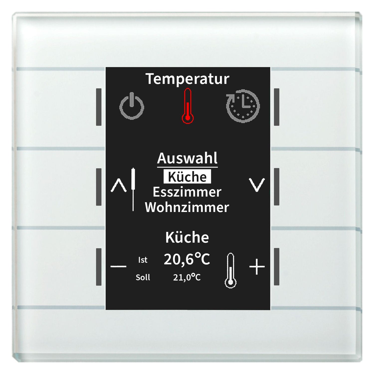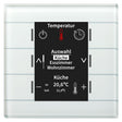 KNX Glas Bedienzentrale Smart mit Farbdisplay, Weiß. Ausführung mit 6 Sensorflächen, Farbdisplay und RGB-Statusanzeige. Zentrale Bedienstelle mit bis zu 24 Bedienfunktionen, Zeitschaltuhr und integriertem Raumtemperaturregler. Großes, aktives Farbdisplay (automatische Helligkeitsanpassung). Vier Direktbedienfunktionen für häufig verwendete Funktionen. 20 Funktionen über Menü und Schaltuhr (z. B. Dimmen/ Jalousie/ Schalten/ Werte senden/ Szenen/ Temperatursollwerte). Codeschloss mit 4-6 Ziffern, zur Gerätesperrung oder Alarm-Scharfschaltung. Tages-/Wochen-/Astro-Zeitschaltuhr (20 Kanäle mit je 6 Schaltzeiten). Urlaubsfunktion mit Zeitraumaktivierung. Automatische Feiertagsberechnung. Komfortabler Raumtemperaturregler mit Temperatursensor. Lüftungssteuerung mit Hand- und Automatikbetrieb. Anzeige von Innen-/Außentemperatur, Sollwert und Uhrzeit/Datum. Anzeige von Statusinformationen (1 Bit) und Meldungen (14 Byte). 6 Status-LEDs unabhängig ansteuerbar. 6 Logikblöcke mit je 4 Eingängen. Keine zusätzliche Spannungsversorgung erforderlich. Einbau in Schalterdose mit mitgeliefertem Tragring. Abmessungen (H x B): 92 x 92 mm. Empfohlene Montagehöhe: 1,60 m. Integrierter Busankoppler. 3 Jahre Produktgarantie.