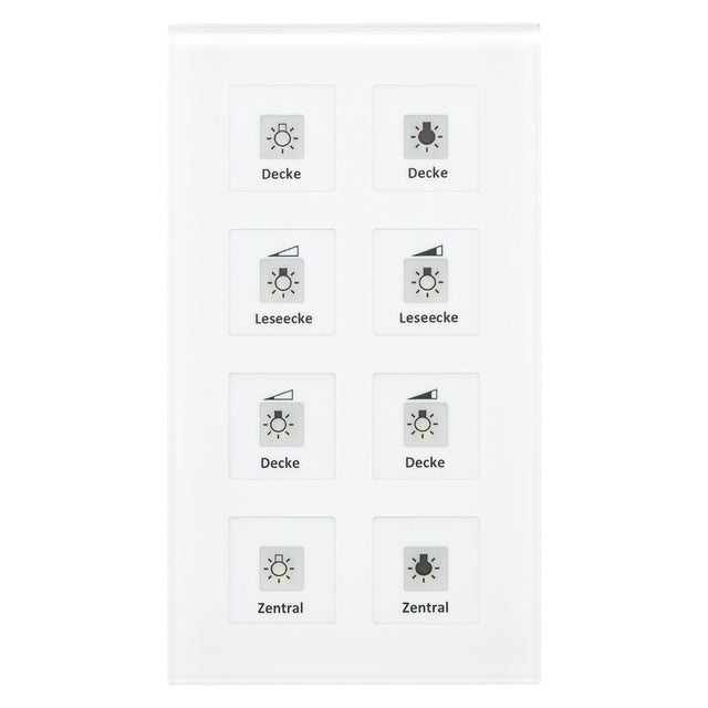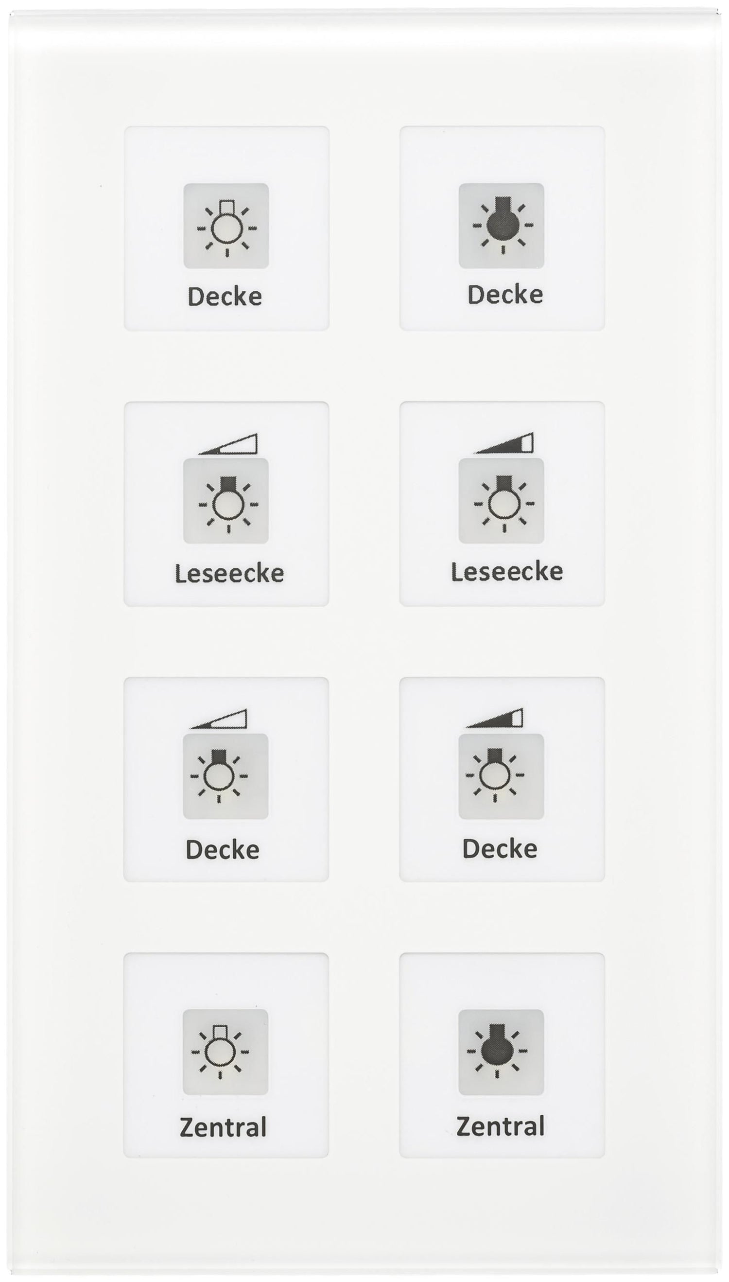 KNX Glastaster Plus 8-fach, Weiß. Ausführung mit 8 Sensorflächen und LEDs für Betriebs-/Statusanzeige. Die Tasten sind als Tastenpaar oder Einzeltasten frei einstellbar. Werte senden, Zwangsführung und Schaltbefehle einstellbar. Kurzer/Langer Tastendruck mit 2 Objekten. Umlaufendes Orientierungslicht. Weiße/Rote LED je Sensorfläche. LED Helligkeit über Tag/Nacht-Objekt in 5 Stufen einstellbar. Ein- und Zweitasterbetrieb für Dimmer/Jalousiefunktionen. Beschriftungsfolie zum Einschieben unter die Glasfläche. Einbau in Schalterdose, Lieferung mit Beschriftungsfolie. Abmessungen (H x B): 163 x 92 mm. Integrierter Busankoppler. 3 Jahre Produktgarantie.