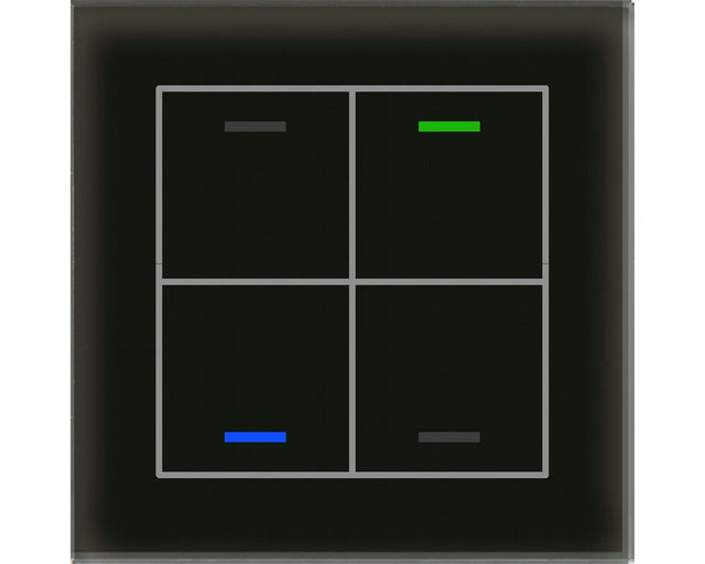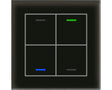 KNX Glastaster II Light 4-fach, RGBW, Schwarz, Neutral. Ausführung Neutral mit 4 Sensorflächen. Mit schwarzem Gehäuserückteil. Umfangreiche Applikation. Die Tasten sind als Tastenpaar oder Einzeltasten frei einstellbar. Ein- und Zweitasterbetrieb für Schalten, Dimmen, Jalousie, Werte. Umschalten von bis zu vier Werten oder Szenen. Kurzer/Langer Tastendruck mit 2 Objekten. Mehrfach-Tippfunktion sendet bis zu 4 Werte auf gleiche oder verschiedene Objekte. Innovative Gruppensteuerung mit langem/extra langem Tastendruck. Patschfunktion mit zusätzlichem Schaltobjekt. Vier RGBW Status-LEDs. LED Helligkeit über Tag/Nacht- oder Helligkeit-Objekt steuerbar. 4 Logikblöcke. Einbau in Schalterdose mit mitgeliefertem Tragring. Abmessungen (H x B): 92 x 92 mm. Integrierter Busankoppler. 3 Jahre Produktgarantie.