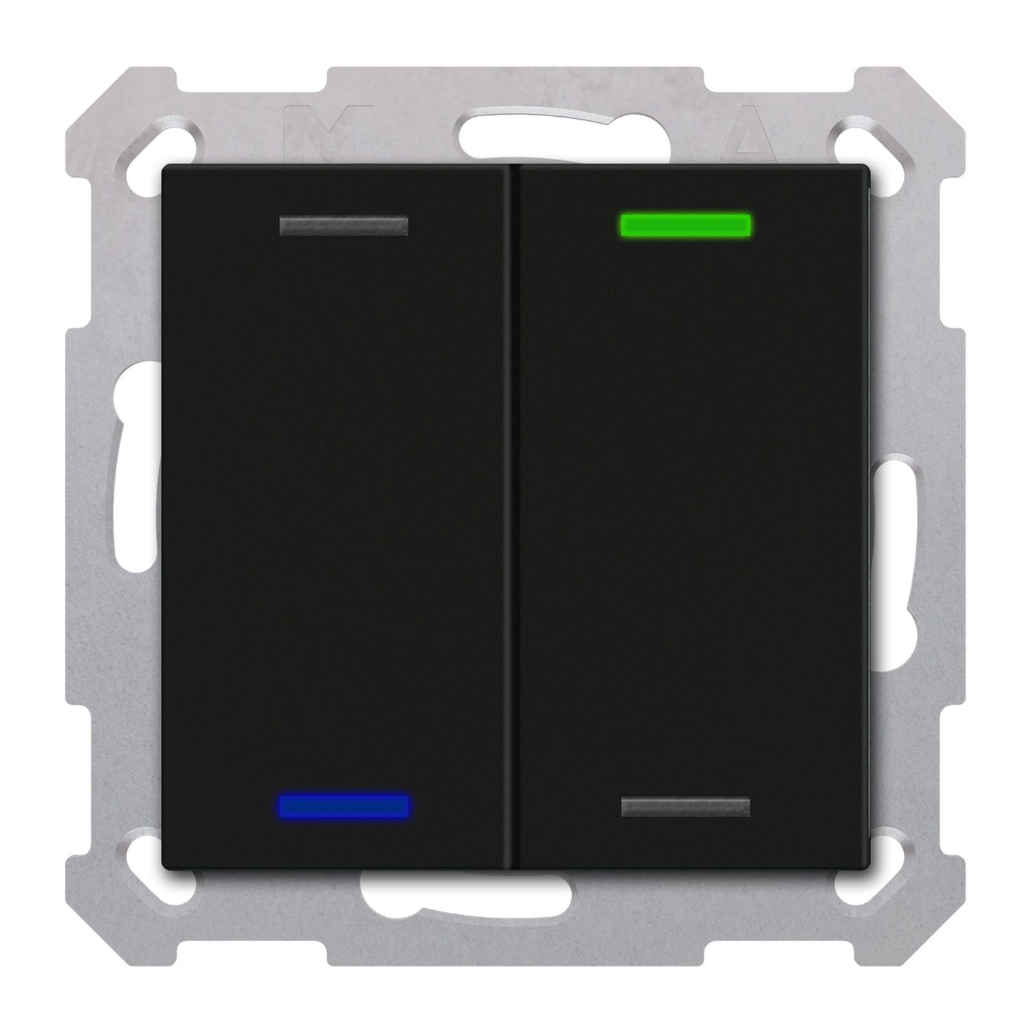 KNX Taster Light 55 2-fach, RGBW, Schwarz matt, Neutral. Ausführung Neutral mit 2 Tastenpaaren / 4 Tasterflächen. Passend für 55 mm Schalterprogramme z. B. MDT Sortiment 55 oder GIRA Standard 55, E2, Event, Esprit oder BERKER S1, B3, B7 oder JUNG A 500, A PLUS, A CREATION, AS 500, A 550, A FLOW oder MERTEN 1M, M-Smart, M-Plan, M-Pure. Die Tasten sind als Tastenpaar oder Einzeltasten frei einstellbar. Ein- und Zweitasterbetrieb für Schalten, Dimmen, Jalousie, Werte. Umschalten von bis zu vier Werten oder Szenen. Kurzer/Langer Tastendruck mit 2 Objekten. Innovative Gruppensteuerung mit langem/extra langem Tastendruck. Mehrfach-Tippfunktion sendet bis zu 4 Werte auf gleiche oder verschiedene Objekte. Zwei RGBW Status-LEDs pro Tastenpaar. LED Helligkeit über Tag/Nacht- oder Helligkeit-Objekt steuerbar. 4 Logikblöcke. Einbau in Schalterdose mit mitgeliefertem Tragring. Integrierter Busankoppler. 3 Jahre Produktgarantie.