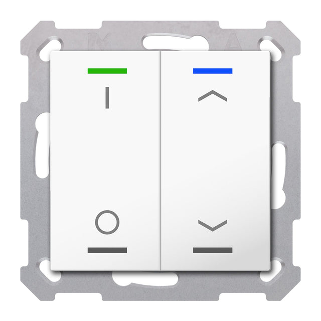 KNX Taster Light 55 2-fach, RGBW, Temperatursensor, Reinweiß glänzend, Sch._Jal.. Ausführung I/O und Auf/Ab Symbol mit 2 Tastenpaaren / 4 Tasterflächen und Temperatursensor. Passend für 55 mm Schalterprogramme z. B. MDT Sortiment 55 oder GIRA Standard 55, E2, Event, Esprit oder BERKER S1, B3, B7 oder JUNG A 500, A PLUS, A CREATION, AS 500, A 550, A FLOW oder MERTEN 1M, M-Smart, M-Plan, M-Pure. Die Tasten sind als Tastenpaar oder Einzeltasten frei einstellbar. Ein- und Zweitasterbetrieb für Schalten, Dimmen, Jalousie, Werte. Umschalten von bis zu vier Werten oder Szenen. Kurzer/Langer Tastendruck mit 2 Objekten. Innovative Gruppensteuerung mit langem/extra langem Tastendruck. Mehrfach-Tippfunktion sendet bis zu 4 Werte auf gleiche oder verschiedene Objekte. Zwei RGBW Status-LEDs pro Tastenpaar. LED Helligkeit über Tag/Nacht- oder Helligkeit-Objekt steuerbar. 4 Logikblöcke. Einbau in Schalterdose mit mitgeliefertem Tragring. Integrierter Busankoppler. 3 Jahre Produktgarantie.