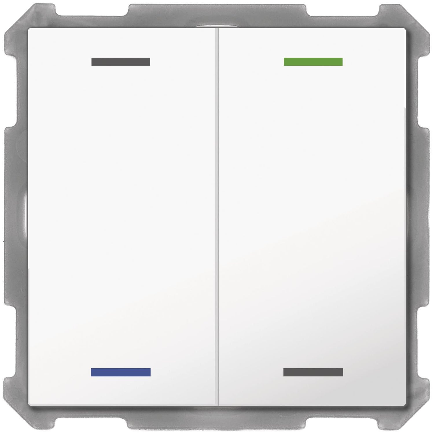 KNX Taster Light 63 2-fach, RGBW, Studioweiß glänzend, Neutral. Ausführung Neutral mit 2 Tastenpaaren / 4 Tasterflächen. Passend für 63 mm Schalterprogramme, z. B. MDT Sortiment 63 oder Busch-Jaeger future linear, solo, carat und Busch-axcent. Die Tasten sind als Tastenpaar oder Einzeltasten frei einstellbar. Ein- und Zweitasterbetrieb für Schalten, Dimmen, Jalousie, Werte. Umschalten von bis zu vier Werten oder Szenen. Kurzer/Langer Tastendruck mit 2 Objekten. Innovative Gruppensteuerung mit langem/extra langem Tastendruck. Mehrfach-Tippfunktion sendet bis zu 4 Werte auf gleiche oder verschiedene Objekte. Zwei RGBW Status-LEDs pro Tastenpaar. LED Helligkeit über Tag/Nacht- oder Helligkeit-Objekt steuerbar. 4 Logikblöcke. Einbau in Schalterdose mit mitgeliefertem Tragring. Integrierter Busankoppler. 3 Jahre Produktgarantie.