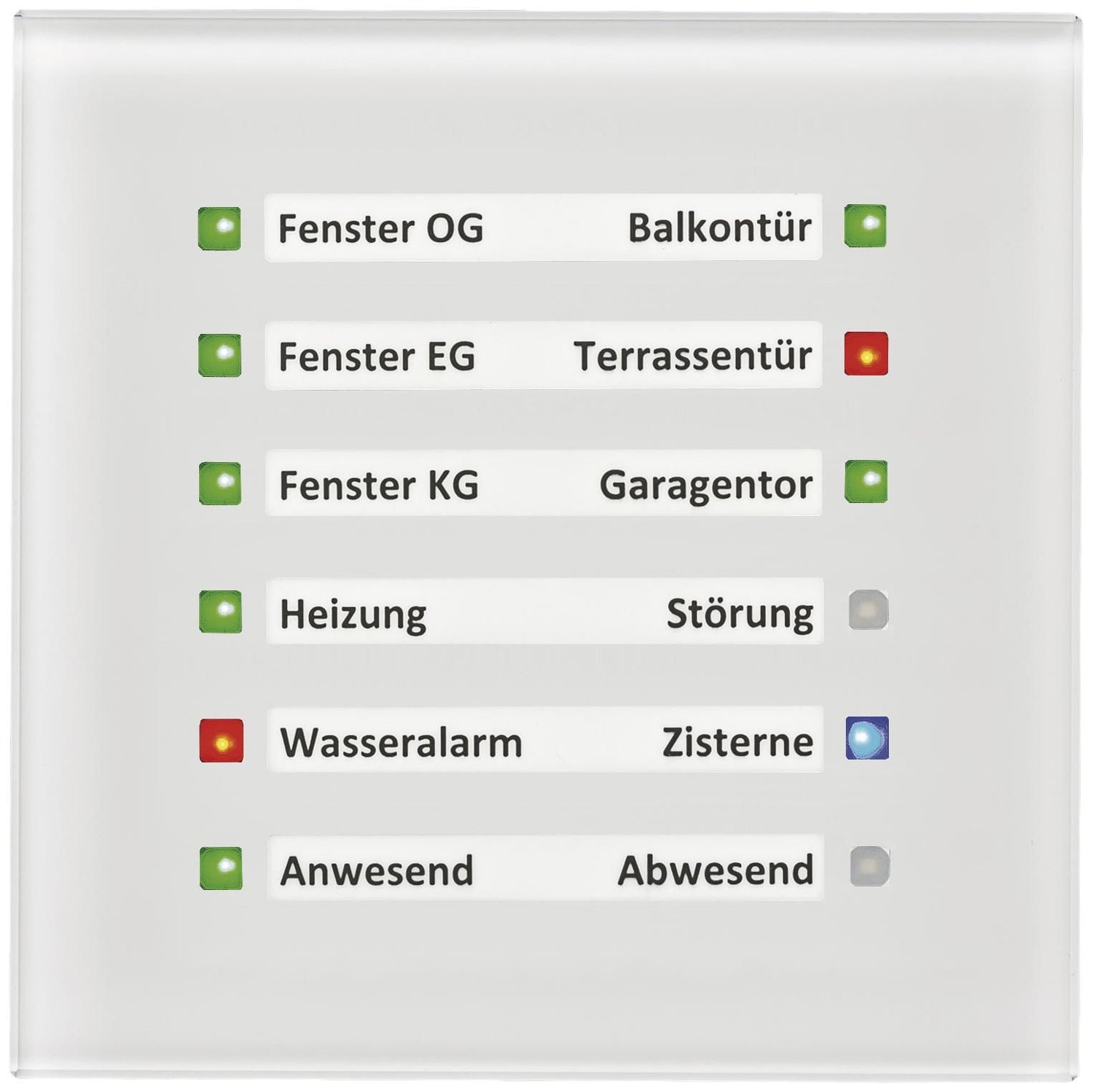 KNX Glas LED Anzeige, Weiß. Ausführung mit 12 RGB-LEDs. 12 schaltbare RGB Status-LEDs. Beschriftungsfolie zum Einschieben unter die Glasfläche. 3 Objekte je LED. 5 Zustände je LED einstellbar (Wert=0, Wert=1, 2 Prioritätsobjekte, Ausfall des Objekts). 8 Logikblöcke mit je 8 Eingängen. 4 Module zum Vergleichen von Telegrammen. 2 Helligkeitsstufen. Tag/Nacht Funktion. Abschaltung/Reduzierung der Helligkeit. Anwesend/Abwesend Objekt. Ausfallüberwachung der Objekte mit Meldefunktion. Meldeobjekt (z. B. Abwesend und Fenster geöffnet). Einbau in Schalterdose mit mitgeliefertem Tragring. Abmessungen (H x B): 92 x 92 mm. Integrierter Busankoppler. 3 Jahre Produktgarantie.