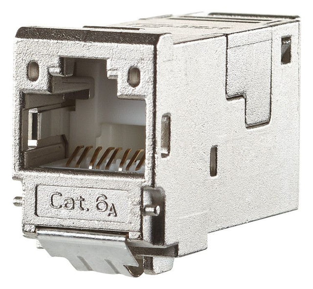 Modulare Anschlusseinheit Cat.6, A, RJ45Cat.6, A Komponentenprüfung nach ISO/IEC 11801, DIN EN 50173-1, ANSI/TIA-568.2-D und IEC 60603-7-51, GHMT zertifiziertEinhaltung der Klasse E, A nach ISO/IEC 11801, DIN EN 50173-1getestet: Link bis 500 MHz, montagefreundlicher Anschluss der 2- bis 4-paarigen Datenleitung AWG 26/1 - 22/1 und Litzenleiter mit 7-drähtiger Cu-Litze AWG 26/7 - 22/7 an BTR 8fach IDC-Schneidklemmen, Kennzeichnung der Adernbelegung T568A und T568B, leichtes und schnelles Einlegen der Adernpaare in das E-DAT modul Ladestück, Modulgehäuse aus Zinkdruckguss, veredelt, Montage ohne Spezialwerkzeug, Zugentlastung mit Kabelbinder am Modul, Befestigungsmöglichkeit für Staubschutzklappe, Einbauform: MC Modul, Kabelzuführung 180°, Lieferung in einer 10er Verpackung, einzeln lieferbar