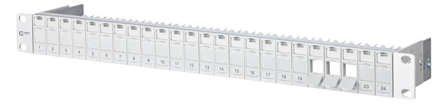 19 Zoll 1HE Modulträger für 24 Einzelmodule in Modulbauform, Modulträgerfront aus silber eloxiertem Aluminium, Modulhalter aus Kunststoff mit Staubschutzklappen (weitere Farben als Zubehör erhältlich) nach vorne entnehmbar, integrierte Kabelabfangung, zusätzliche Zugentlastung möglich, Sichtfenster für beiliegende Beschriftungseinlage, Beschriftungsbogen 210 x 297 mm siehe Zubehör, Erdungsbolzen M6 x 10 mit Mutter und Zahnscheibe, inkl. 30 cm Erdungskabel, alle vollgeschirmten Module mittels Erdungsschiene verbunden