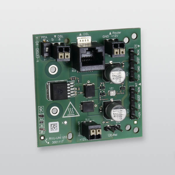 VdS-anerkannt, Zubehör der ÜE Die Platine RVU-UNI eignet sich zur ausfallsicheren Stromversorgung eines DSL-Routers. Die Platine führt die Versorgungsspannung vom Steckernetzteil (bei Netzbetrieb) und vom Netzteil der Übertragungseinrichtung (bei Netzausfall) zum Router.