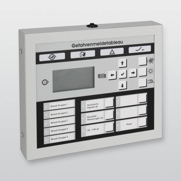 Das Gefahrenmeldetableau GMT 4000 ist eine zusätzliche Anzeige- und Bedieneinrichtung für die Brandmelderzentrale hifire 4400 / Brandwarnanlage hifire 4100 XS. Die Anbindung kann entweder über den redundanten System 4000-BUS von IFAM oder direkt über die serielle Schnittstelle der BMZ / BWA realisiert werden. Die Betriebszustände und sämtliche Klartextanzeigen können über kapazitive Tasten abgefragt werden. Über das Grafikdisplay können 2 Meldungen gleichzeitig dargestellt werden. Die Funktionen Signalgeber-Abschaltung, Rücksetzen von Alarmen, Brandfallsteuerung ab und Übertragungseinrichtung ab sind im Auslieferungszustand implementiert. Die fünf Meldergruppen-Anzeigen sind auf Gruppe 1-5 definiert. Über die Software Prog4000 können diese Anzeigen auf andere Meldergruppen zugeordnet werden. Die ausführenden Funktionen sind passwortgeschützt.