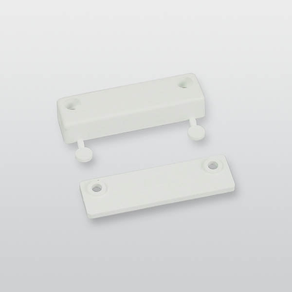 Aufbaugehäuse bestehend aus Gehäuseoberteil mit Bodenplatte 1,2 mm sowie 2 Abdeckkappen für Schraublöcher. Je Magnetkontakt werden 2 Aufbaugehäuse benötigt.
