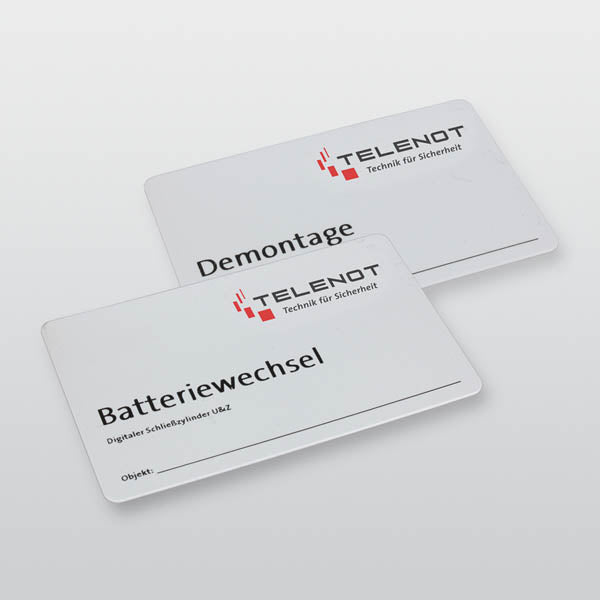 Batteriewechsel- und Demontagekarte, kompatibel zum EM 4200 und MIFARE Classic-Protokoll. Die Karten sind als Kombi-Karten ausgeführt. Zur eindeutigen Identifizierung sind die Karten mit „Batteriewechsel“ und „Demontage“ beschriftet. Um die Karten einem Objekt zuordnen zu können, bieten die Karten ein Beschriftungsfeld für Ihre Objektdaten.
