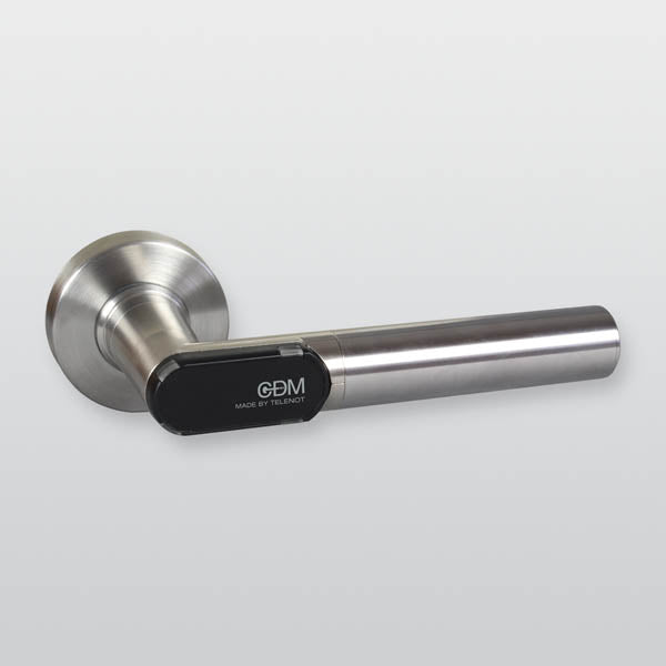 Der Digitale Türdrücker Offline/Online- Funk CDM ermöglicht die elektronische Zutrittskontrolle eines Zutrittspunktes im Innenbereich. Die Bauform L1 mit einer 90°-Biegung zeichnet sich durch ein schlichtes und zeitloses Design aus. Wird ein herkömmlicher Türdrücker in einem Bestandsobjekt gegen einen Elektronischen Türdrücker getauscht, deckt die Rundrosette die DIN-Bohrungen ab und die Befestigungslöcher können in der Regel wieder verwendet werden. Der Digitale Türdrücker ist sowohl im Offline-System CDM als auch im Online- Funk-System CDM einsetzbar.