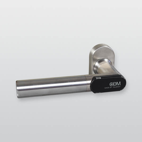 Der Digitale Türdrücker Offline/Online- Funk CDM ermöglicht die elektronische Zutrittskontrolle eines Zutrittspunktes im Innenbereich. Die Bauform L1 mit einer 90°-Biegung zeichnet sich durch ein schlichtes und zeitloses Design aus. Die Ovalrosette ermöglicht unter anderem den Einsatz des Elektronischen Türdrückers an Rohrrahmentüren. Der Digitale Türdrücker ist sowohl im Offline-System CDM als auch im Online- Funk-System CDM einsetzbar.