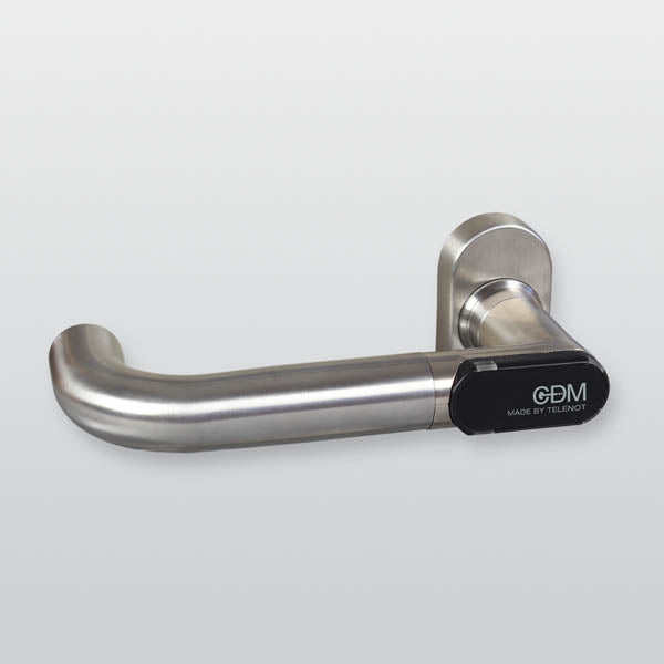 Der Digitale Türdrücker Offline/Online- Funk CDM ermöglicht die elektronische Zutrittskontrolle eines Zutrittspunktes im Innenbereich. Bei der Bauform U2 bietet die zweite 90° -Biegung Schutz vor "Einfädeln" von Mensch oder Material. Die hintere Kröpfung unterstützt den Handballen beim Öffnen der Tür. Die Bauform U2 wird bevorzugt in öffentlichen Gebäuden eingesetzt. Die Ovalrosette ermöglicht unter anderem den Einsatz des Elektronischen Türdrückers an Rohrrahmentüren. Der Digitale Türdrücker ist sowohl im Offline-System CDM als auch im Online- Funk-System CDM einsetzbar.