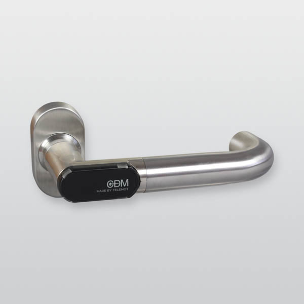 Der Digitale Türdrücker Offline/Online- Funk CDM ermöglicht die elektronische Zutrittskontrolle eines Zutrittspunktes im Innenbereich. Bei der Bauform U2 bietet die zweite 90° -Biegung Schutz vor "Einfädeln" von Mensch oder Material. Die hintere Kröpfung unterstützt den Handballen beim Öffnen der Tür. Die Bauform U2 wird bevorzugt in öffentlichen Gebäuden eingesetzt. Die Ovalrosette ermöglicht unter anderem den Einsatz des Elektronischen Türdrückers an Rohrrahmentüren. Der Digitale Türdrücker ist sowohl im Offline-System CDM als auch im Online- Funk-System CDM einsetzbar.