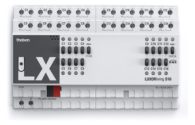 Schaltaktor mit Relaisausgängen für 16 Schaltkanäle für das Smart Home System LUXORliving, LED Schaltzustandsanzeige für jeden Kanal, Handschalter mit Statusanzeige (auch ohne Busspannung), Kontaktart (Öffner/Schließer) und Teilnahme an Zentralbefehlen wie Dauer-Ein und Zentral-Schalten, Schaltfunktionen: Ein/Aus, Treppenlicht mit Vorwarnen, Rückmelde-Objekt für jeden Kanal, Zentral-Objekte mit und ohne Priorität