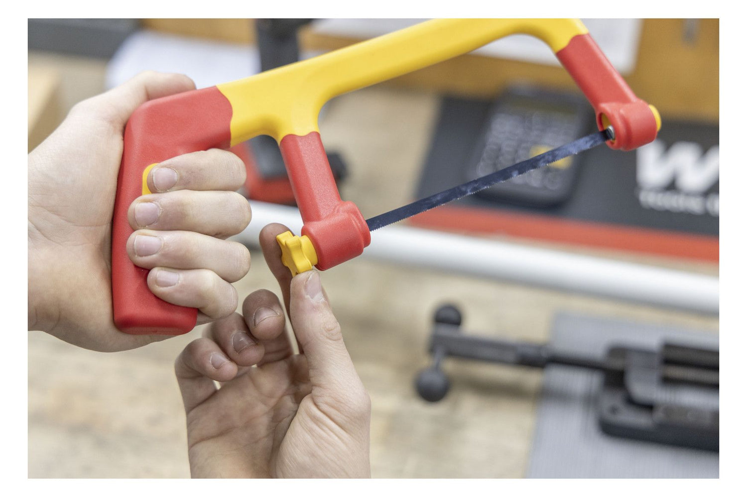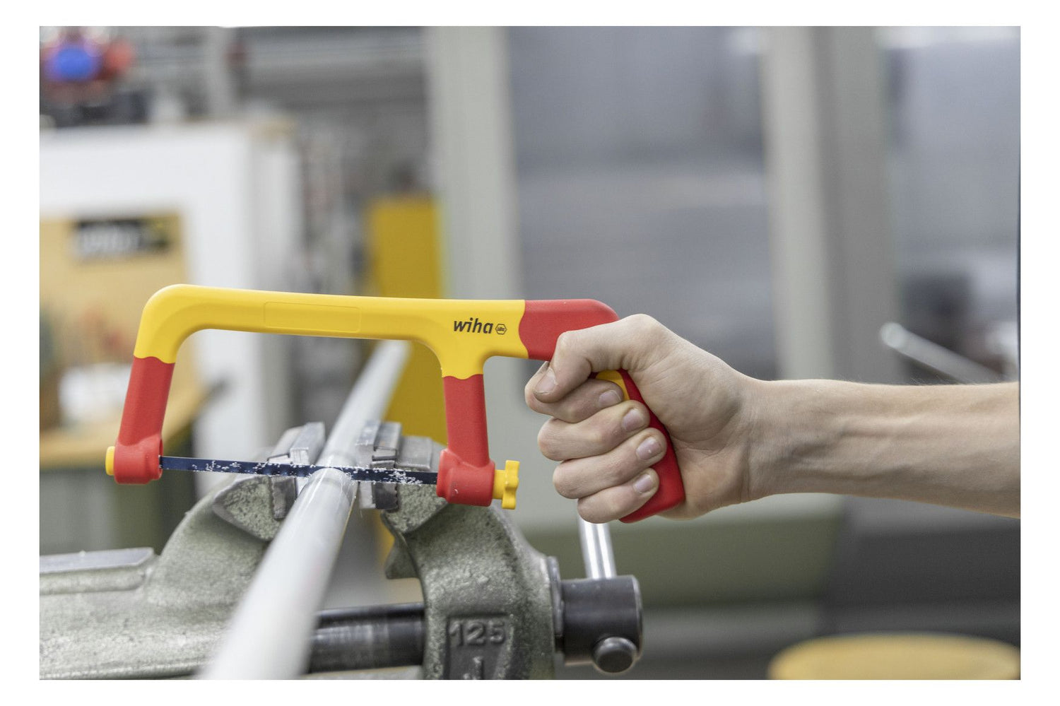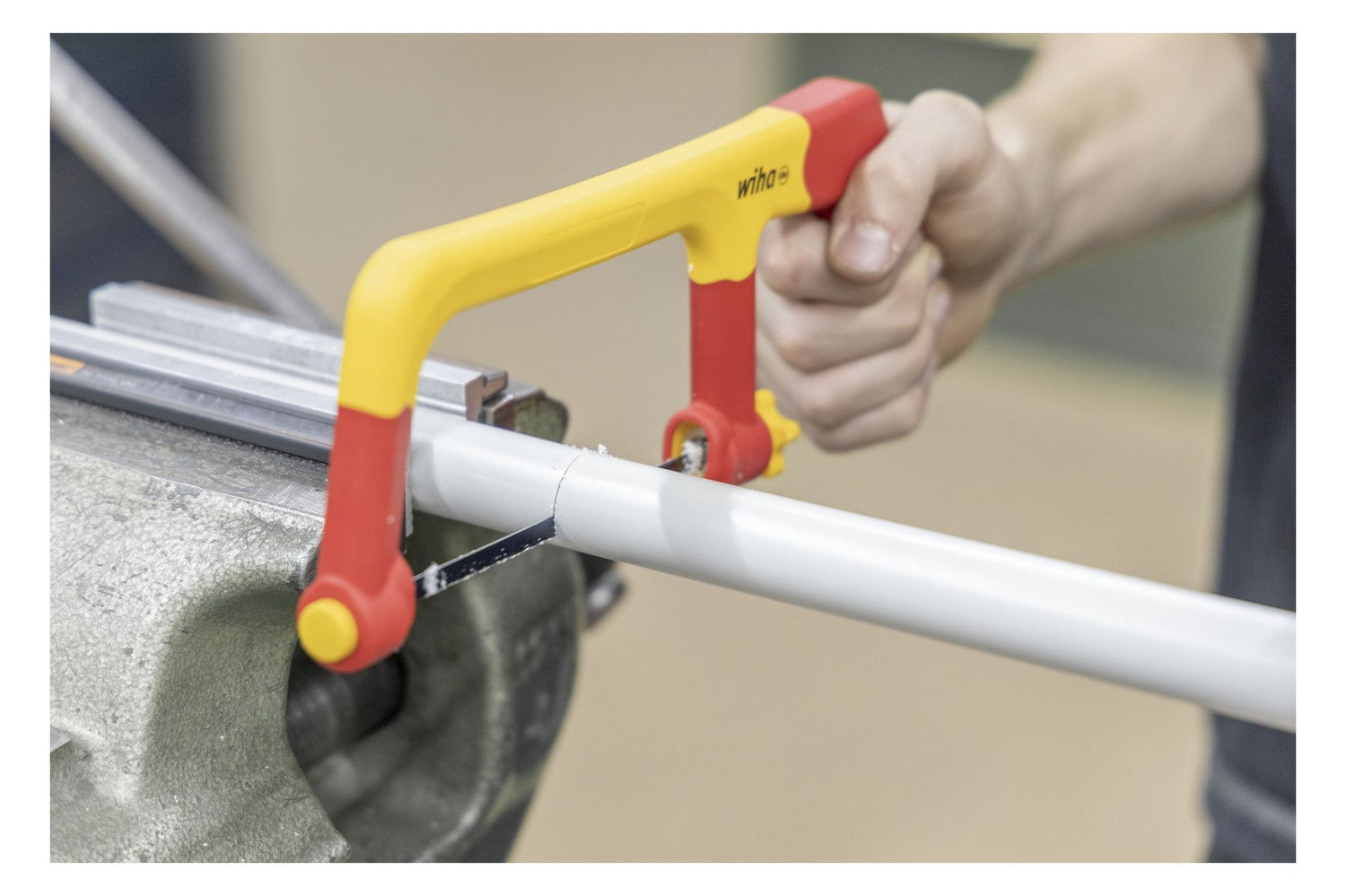 <p><b>Steigert Ihre Effizienz</b>: Das feinzahnige Sägeblatt ermöglicht einen sauberen Schnitt, beispielsweise an Kunststoffrohren und Kabelkanälen aus Metall.</p><p><b>Erleichtert die Handhabung</b>: Mithilfe der Kunststoffschraube kann das Sägeblatt schnell und einfach gewechselt werden.</p><p><b>Erleichtert die Handhabung</b>: Der ergonomische Handgriff ist sowohl für Rechts- als auch Linkshänder geeignet.</p><p><b>Senkt Ihre Kosten</b>: Langlebig und stabil dank Bimetall-Sägeblatt.</p><p><b>Bietet Ihnen vollen Schutz</b>: Jedes Werkzeug einzeln bei 10.000 V AC getestet und zugelassen für 1.000 V AC.</p><p><b>Maße Produkt</b>: 376 x 130 x 32 mm (L x B x T)</p><p><b>Anwendung</b>: Zum Absägen von Kunststoffrohren, Elektro-Installationsrohren, Kabelkanäle aus Kunststoff oder Metall. Ideal für das Anwendungsgebiet von Elektrikern und Elektrofachkräften.</p><p>Ablängen von Kunststoffrohren oder Kabelkanälen aus Metall</p><p>Inklusive 2 Ersatzsägeblätter</p><p>Einfaches und schnelles Wechseln der Sägeblätter</p><p>Sicheres Arbeiten bis 1.000 V AC</p><p>Hand- und muskelschonendes Arbeiten</p><p>Bei der Elektroinstallation müssen Elektriker für das Ablängen von Rohren oder Kabelkanälen oft zu einer Handsäge greifen. Wiha hat die perfekte Lösung parat: Die Bügelsäge electric. Dank des isolierten Griffs bietet sie für Arbeiten an spannungsführenden Teilen bis 1.000 V vollen Schutz. Weiterhin liegt die 280 mm lange Säge dank dem ergonomisch geformten Griff auch für Linkshänder gut in der Hand. Im Set sind zudem zwei Sägeblätter mit 150 mm Länge als Ersatz dabei. Ist die Zahnung abgestumpft, können die Sägeblätter der Elektriker Säge schnell und einfach gewechselt werden. Die Kunststoffschraube ermöglicht ein leichtes Einspannen und Verstellen des Sägeblattes.</p><p>Geprüft gemäß IEC 60900.</p>