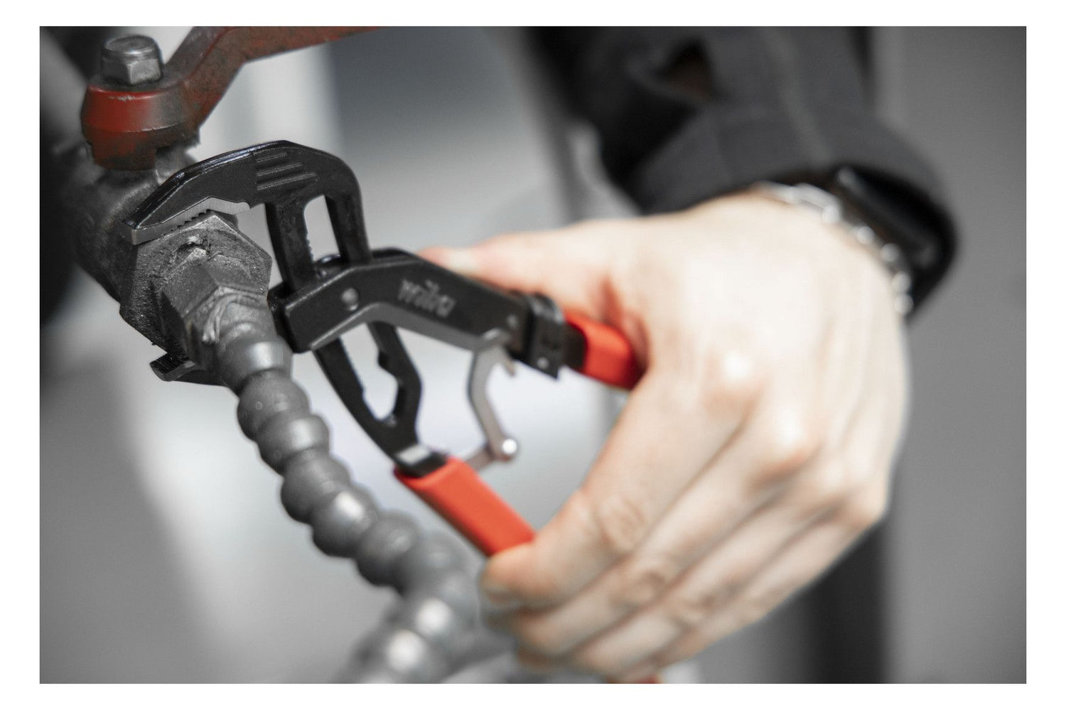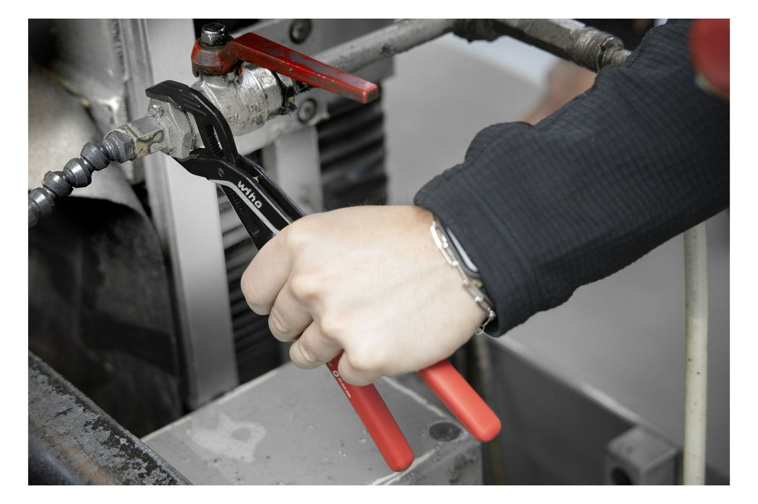 <p><b>Erleichtert die Handhabung</b>: Einfache automatische Einstellung des durchgesteckten, fein abgestuften Gelenkes.</p><p><b>Spart Zeit</b>: Schnelle Einstellung der Öffnungsweite insbesondere bei ständig wechselnden Anwendungssituationen.</p><p><b>Maße Produkt</b>: 255 x 18 x 60 mm (L x B x T)</p><p><b>Anwendung</b>: Zum schnellen und optimalen Greifen und Halten von Rohren und eckigen Profilen wie Sechskantmuttern im Installationsbereich.</p><p>Drehen, Ziehen, Greifen und Halten von z. B. Rohren oder Kontern von Schrauben und Muttern</p><p>Schnelle automatische Einstellung der Greifweite auf das Werkstück</p><p>Maximale Variabilität dank feinverzahntem Gleitgelenk</p><p>Höchste Stabilität dank durchgestecktem Gelenk</p><p>Bei Installationsarbeiten müssen Rohre, Muttern sowie runde und kantige Materialien in den verschiedensten Abmessungen bearbeitet werden. Den optimalen Halt bietet eine Wasserpumpenzange. Mit einer Rastenverstellung bietet sie maximale Variabilität bei Arbeiten im Installationsbereich, wobei die passgenaue, mechanische Einstellung automatisch beim Greifen des Werkstücks erfolgt. Dabei sind Quetschverletzungen dank des integrierten Klemmschutzes ausgeschlossen. Die Zange ist mit einem durchgesteckten Gelenk versehen, mit dem höchste Stabilität durch die doppelte Führung gewährleistet wird. Gleichzeitig sorgt die schlanke Bauform im Kopf- und Gelenkbereich für einen einfach Zugang zum Werkstück, auch in beengten Arbeitsumgebungen. Die Zangengriffe sind aus rutschhemmendem Kunststoff und verhelfen dem Anwender zu starkem Halt, selbst in öligen oder nassen Arbeitssituationen. Zusätzlich wird das Abrutschen am Werkstück durch die Selbstklemmung an Rohren und Muttern verhindert und dadurch höchst komfortables Arbeiten ermöglicht. Während dem Einsatz garantieren die hochwertigen, spezialgehärteten Zähne sicheres Greifen, auch nach langjähriger Verwendung. Die robusten Wasserpumpen Zangen sind unempfindlich gegen Schmutz.</p><p>DIN ISO 8976.</p>